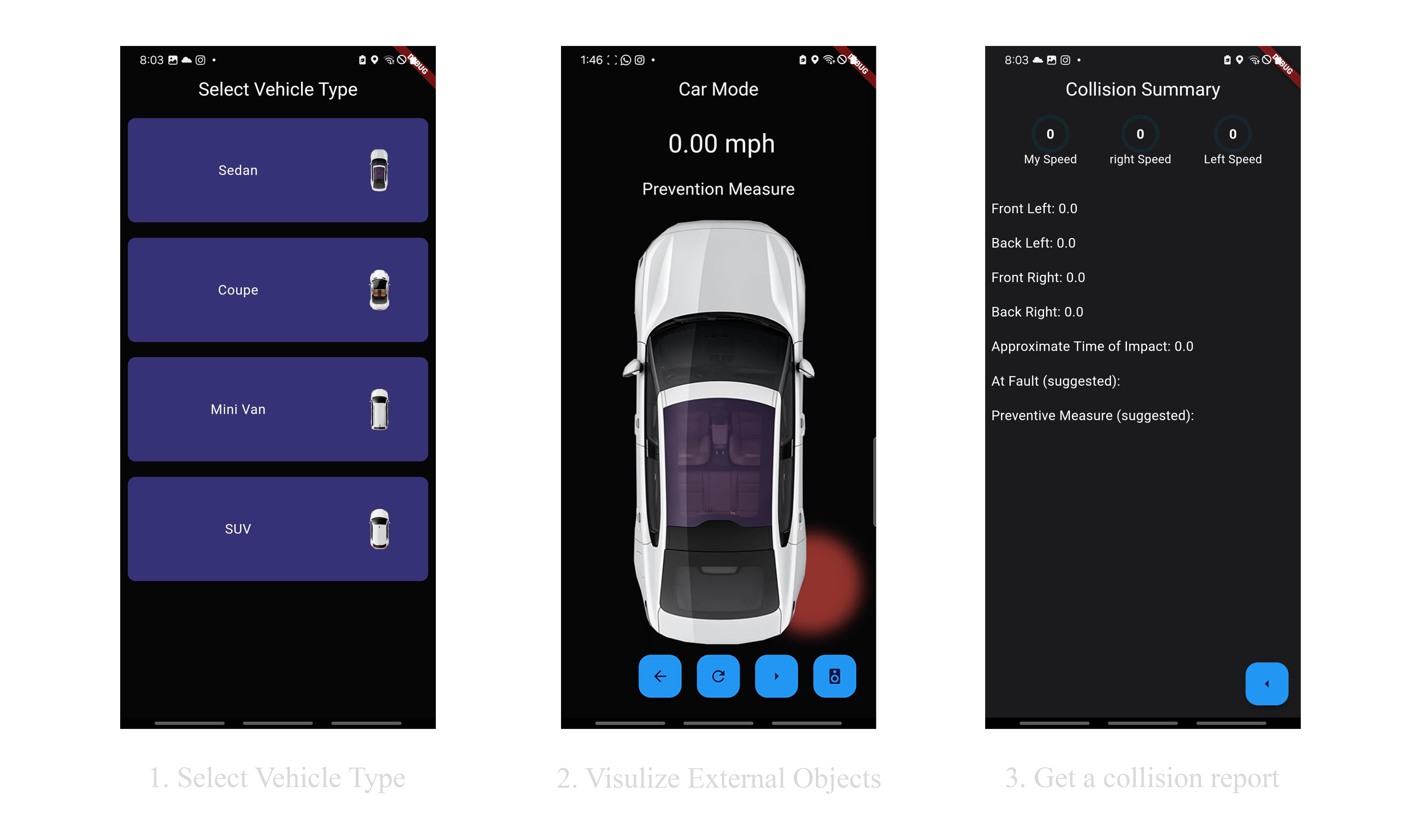 Dom now has access to blind spot navigation, visual alerts when an object is getting close to his vehicle, audio alerts when an object is getting too close to his car, prediction of when a sideswipe accident is about to happen based on the behaviors of the cars next to collision reports when an accident occurs including data such as the exact time of impact, speed of the current car and any neighboring cars as well as preventive measures that could have been taken and the suggested at-fault driver.